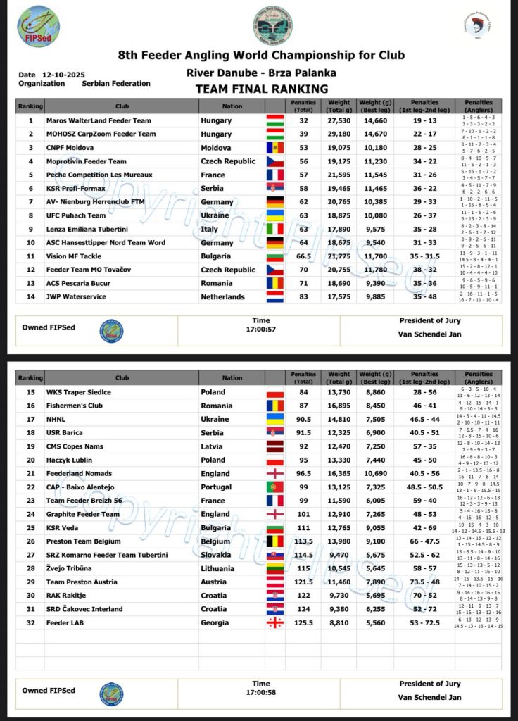 A rendkívül nehéz körülmények között zajló versenyen a magyar klubok taktikai felkészültsége és kitartása döntött. A Maros–WalterLand csapat immár másodszor szerezte meg a világbajnoki címet, míg a MOHOSZ–CarpZoom–Molnársziget gárda a legtöbb fogott súllyal zárt a második helyen.