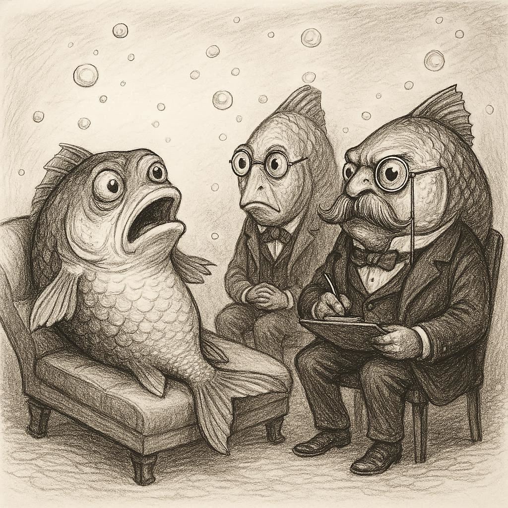 JUNGOVICI (încântat): Interesant! Visul ca memorie trans-generațională! Poate nu tu ai fost prins, ci un strămoș de-al tău. Poate porți în tine trauma unui pește de secol trecut. Ai încercat regresia în nămol?